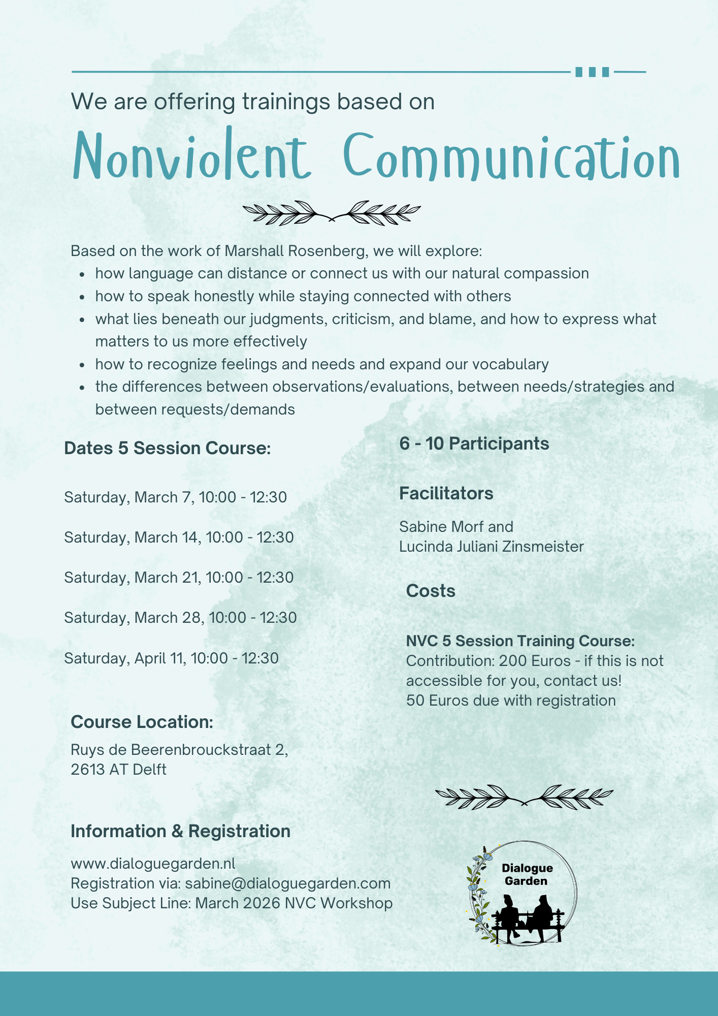 This training is for those who want to continue exploring the world that can open up with Nonviolent Communication after the basic course. Depending on time and wishes of participants, we will further apply the tools we learned to real live situations and explore topics such as: